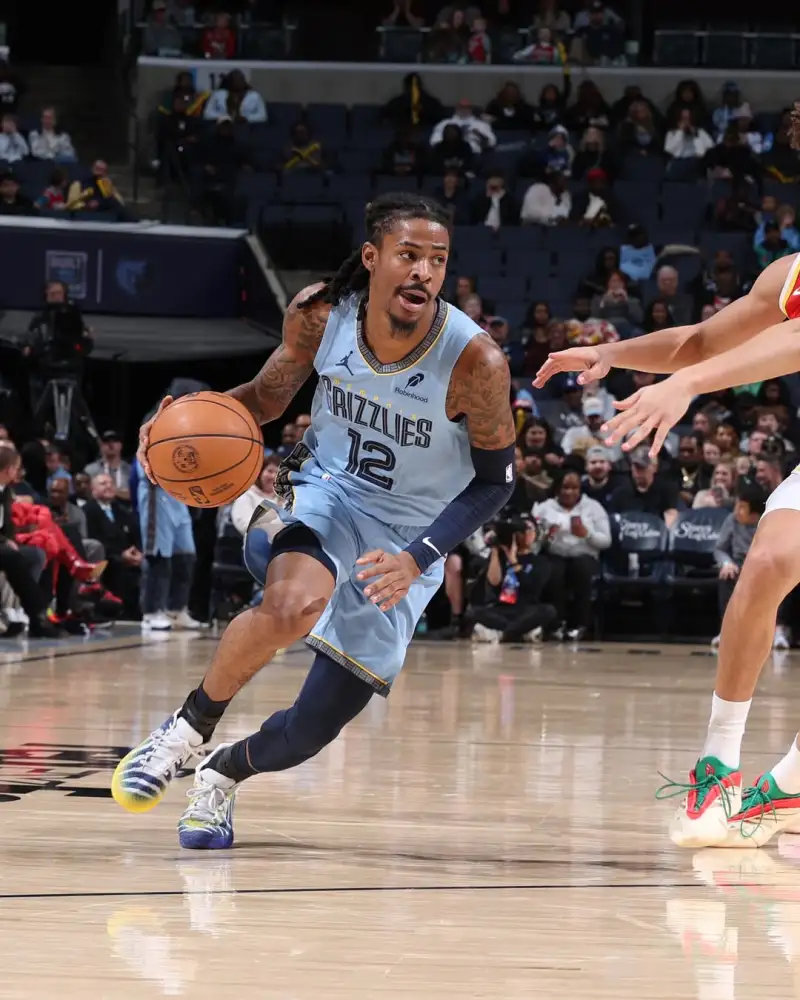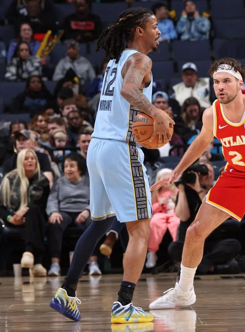 虎扑01月22日讯 今日NBA常规赛灰熊122-124不敌老鹰。本场比赛,灰熊队球员贾-莫兰特出战30分钟,投篮15中7,三分球4中1,罚球8中8,得到23分2篮板12助攻1抢断3盖帽。比赛中,莫兰特上脚母校莫瑞州立大学配色Nike JA3“Murray State University”...