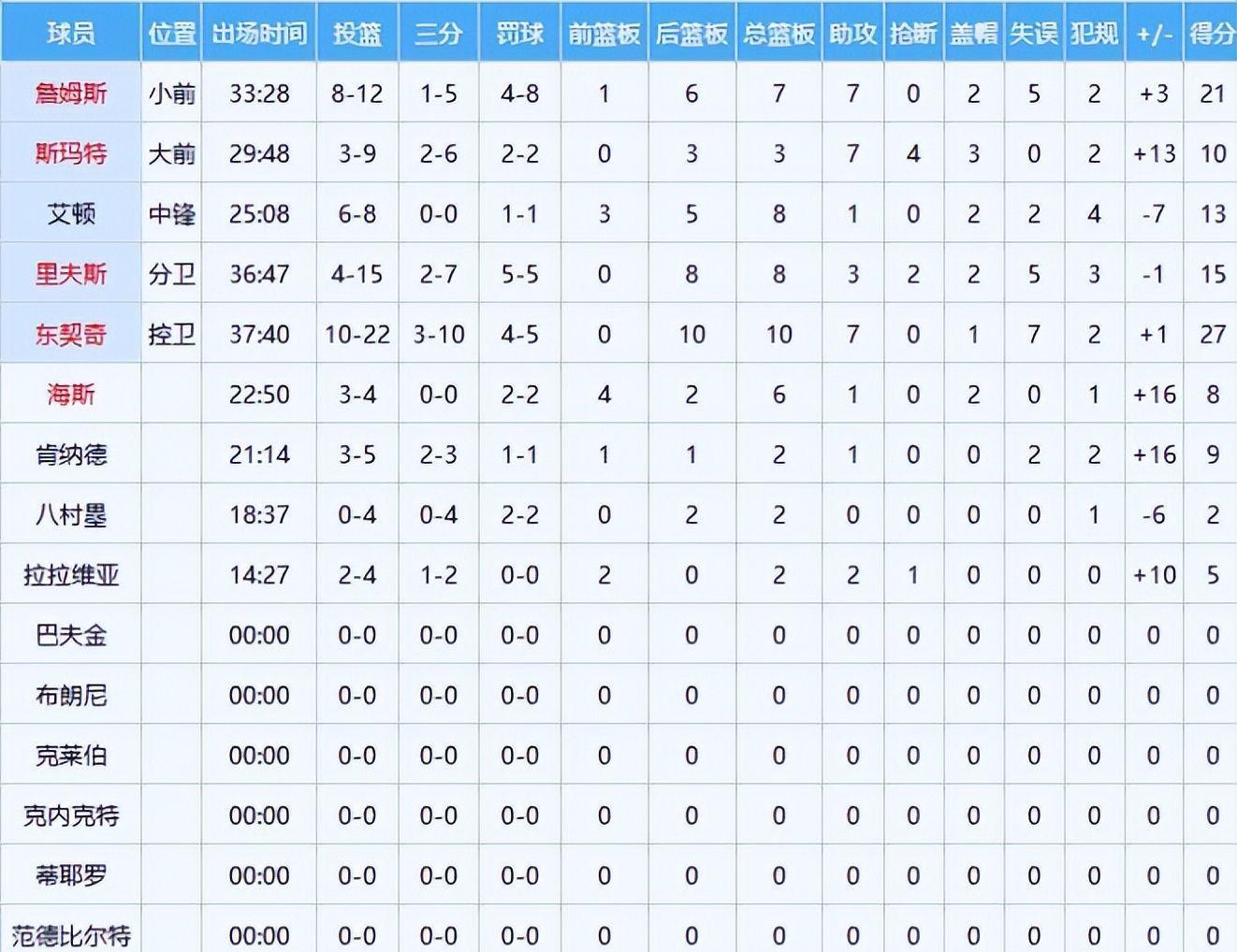 数据不会说谎:东契奇在得分、篮板、助攻三项基础指标上全面压制詹姆斯,且末节净效率值高达+21,为全队最高。当一支球队在最胶着时刻需要有人站出来终结比赛,他做到了——这份担当与执行力,足以配得上“本场最大赢球功臣”的全部荣光。